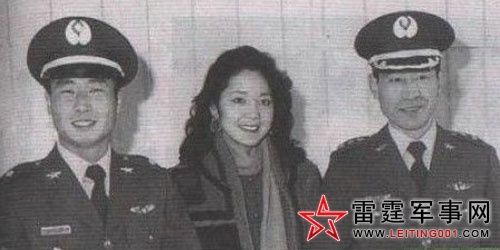 邓丽君和大陆叛逃飞行员王学成(左)孙天勤(右)合影照片。