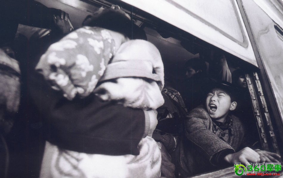 2002年春运,一节拥挤的车厢中,一名小男孩被挤得大叫。