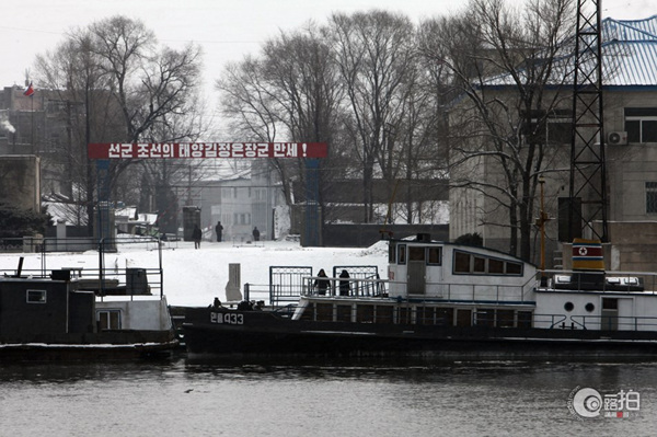 2月12日,朝鲜新义州,鸭绿江边巡逻的朝鲜士兵,鸭绿江作为中朝边境的界河,可以允许船只行驶在江面上,但不可以上岸,否则视为越境。