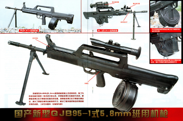 近日,一组国产新型95-1式班用机枪的构造图在网络上首次曝光。95-1式班用机枪是在QJB95式5.8毫米班用机枪基础上改进而成,除自动步枪共同一些改进之处以外,对弹鼓进弹口位置进行改进。原弹鼓进弹口位于弹鼓中心偏右的位置,现弹鼓进弹口位于弹鼓右侧边沿,减小了弹鼓右侧突出枪身的尺寸,解决了握持握把射击时弹鼓硌手臂的问题。