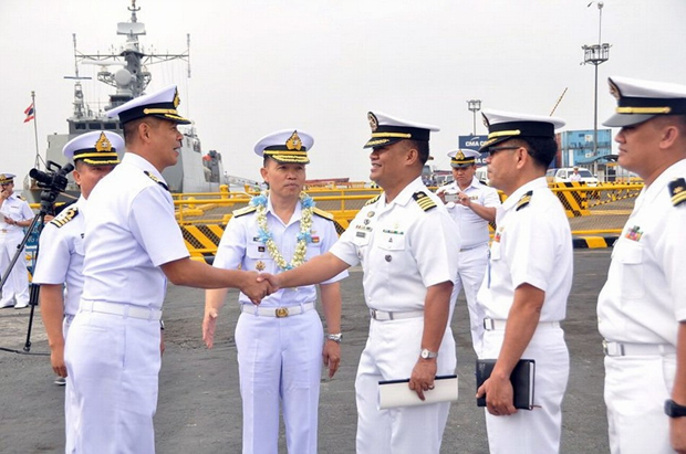 菲律宾海军官员在港口迎接来访的泰国皇家海军