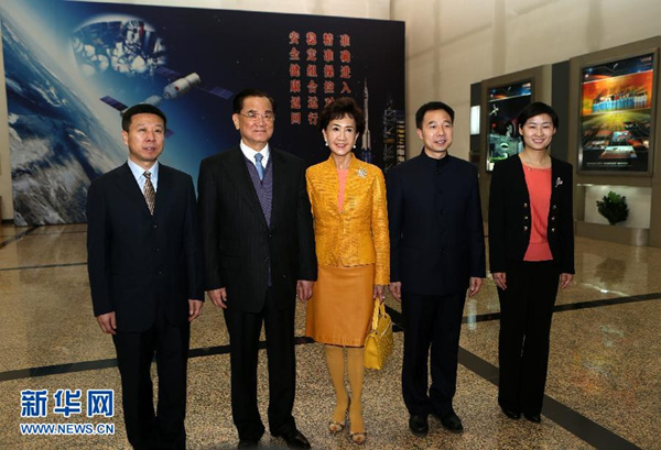 2月27日,中国国民党荣誉主席连战(左二)和夫人连方瑀(左三)与航天员刘旺(左一)、景海鹏(左四)、刘洋(右一)合影。