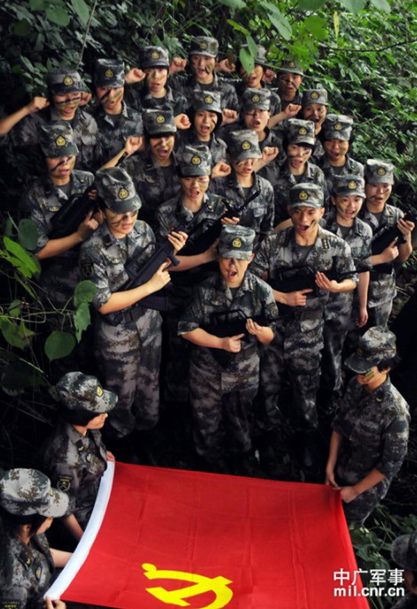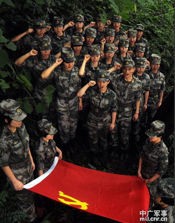 “铿锵玫瑰心向党,不爱红装爱武装。”这是成都军区驻渝某部外训场上经常响起的口号。在艰苦陌生的野外环境中,该部女战士不提困难、不分性别、 不讲条件,积极投身创先争优活动,坚决完成了党和上级赋予的各项任务,分队党支部被评为先进基层党支部,5人荣获优秀共产党员,3人因为工作成绩突出火线 入党。图为6月26日下午,指导员带领数十名女战士面向党旗庄严宣誓:忠诚履行使命,争当打赢精兵。