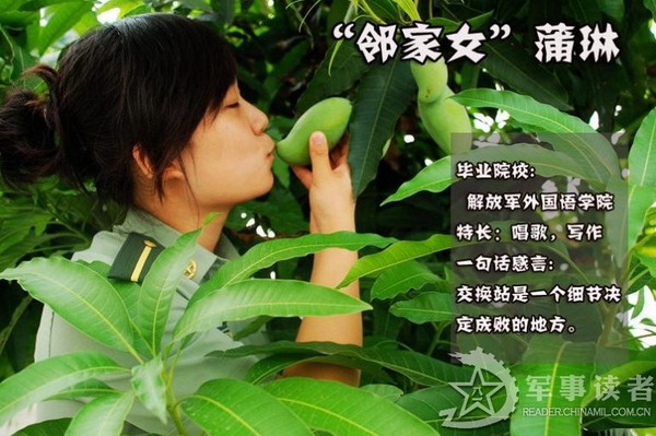 “才女”傅诗芸。傅诗芸是一个从名字里就透露着“才气”的女孩儿。唱歌、跳舞、乐器 傅诗芸都样样精通。然而这位才女起初对于交换站的生活却有点不太适应。初来交换站,傅诗芸感到和在学校大不一样,每天无论是上机房还是开饭都要集合站队, 这让傅诗芸很不适应,不像在学校里那么自由自在。在机房跟班值勤时傅诗芸也感到原来通信工作是那么的枯燥乏味,而且在机房的秩序还必须那么正规。让傅诗芸 印象最深刻的还要数在交换站第一次参加紧急集合。当时毫无准备的她不仅最后一个下楼,还带错了装具,这让傅诗芸感到非常丢人,同时也找到了自己的差距。之 后傅诗芸开始努力地适应连队生活,不断的改掉自己从前一些娇气的坏毛病,我们发现这个女孩已经慢慢地融入到连队生活中了。八一晚会,傅诗芸还利用自己的特 长,为晚会节目《丰碑》制作了视频,这让许多官兵都刮目相看,大家都说才女不愧是才女。      “邻家女”蒲琳。爱好唱歌和写作的蒲琳看上去总会给人一种邻家女孩的感觉。蒲琳说在交换站当兵锻炼期间自己找到了许多差距,首先是找到了学校与基层部队的 差距,到了连队才知道什么才是真正的当兵生活,同时还找到了当学员与当兵的差距,现在才知道要当好一名合格兵不容易。此外自己还经历了很多第一次:第一次 登台演出,第一次写新闻稿,第一次当队列指挥等等。让蒲琳感触最深的还要属八一晚会的舞台布置了,在接到任务后,蒲琳与其他几名学员一起奋战了两天两夜, 终于圆满完成了会场布置任务。在看到自己通过艰辛劳动换来的成果时,蒲琳终于第一次有了这么大的成就感,这也是她当兵锻炼最大的收获。