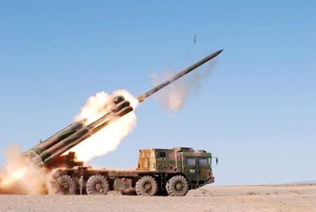 资料图:解放军A-100远程多管火箭炮齐射。